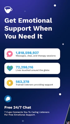 7 कप के साथ, आप सक्रिय रूप से सुनने में प्रशिक्षित देखभाल करने वाले श्रोताओं से कभी भी, कहीं भी 1-1 चैट के माध्यम से जुड़ सकते हैं। हमारी विशाल वैश्विक नेटवर्क में 450,000 से अधिक प्रशिक्षित स्वयंसेवक और प्रमाणित चिकित्सक शामिल हैं, जो 189 देशों और 140 भाषाओं में सहायता प्रदान करते हैं। आप अपनी विशिष्ट आवश्यकताओं के अनुसार श्रोता चुन सकते हैं, चाहे वह रिश्तों की समस्याएँ हों या व्यक्तिगत संघर्ष। इसके अतिरिक्त, ऐप आपको 300 से अधिक निःशुल्क ध्यान अभ्यासों, मनोदशा को बेहतर बनाने वाली सरल गतिविधियों और प्रेरणादायक लघु वीडियो के माध्यम से आत्म-सुधार का अवसर प्रदान करता है। यदि पेशेवर मार्गदर्शन की आवश्यकता हो, तो आप लाइसेंस प्राप्त चिकित्सक के साथ ऑनलाइन संदेश चिकित्सा का भी लाभ उठा सकते हैं।