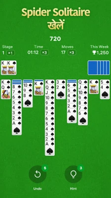 "Spider Solitaire" में कठिनाई के अनेक स्तर आपका इंतज़ार कर रहे हैं। चाहे आप शुरुआती हों या माहिर खिलाड़ी, 1, 2, या 4 सूट के पत्तों के साथ खेलकर आप अपने अनुभव के अनुसार चुनौती चुन सकते हैं। घटते क्रम में पत्तों को व्यवस्थित करने की कला में महारत हासिल करें और अपनी रणनीतिक सोच को नई ऊंचाइयों पर ले जाएँ। प्रतिदिन नई चुनौतियों का सामना करें और मौसमी आयोजनों में भाग लेकर विशेष कलाकृतियाँ और पोस्टकार्डों का अनूठा संग्रह तैयार करें। प्रत्येक माह ट्रॉफियाँ अर्जित करके अपनी प्रगति का जश्न मनाइए।